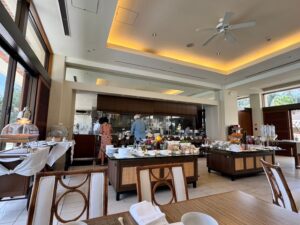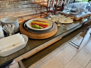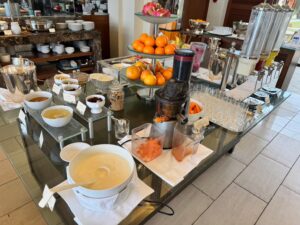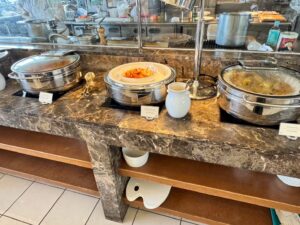 朝食はビュッフェ形式ですが、いわゆるリゾートホテルの豪快な朝食とは少し方向性が違います。揚げ物や重たい料理が前面に出るのではなく、野菜、フルーツ、スープなど、身体にやさしいものが中心でした。